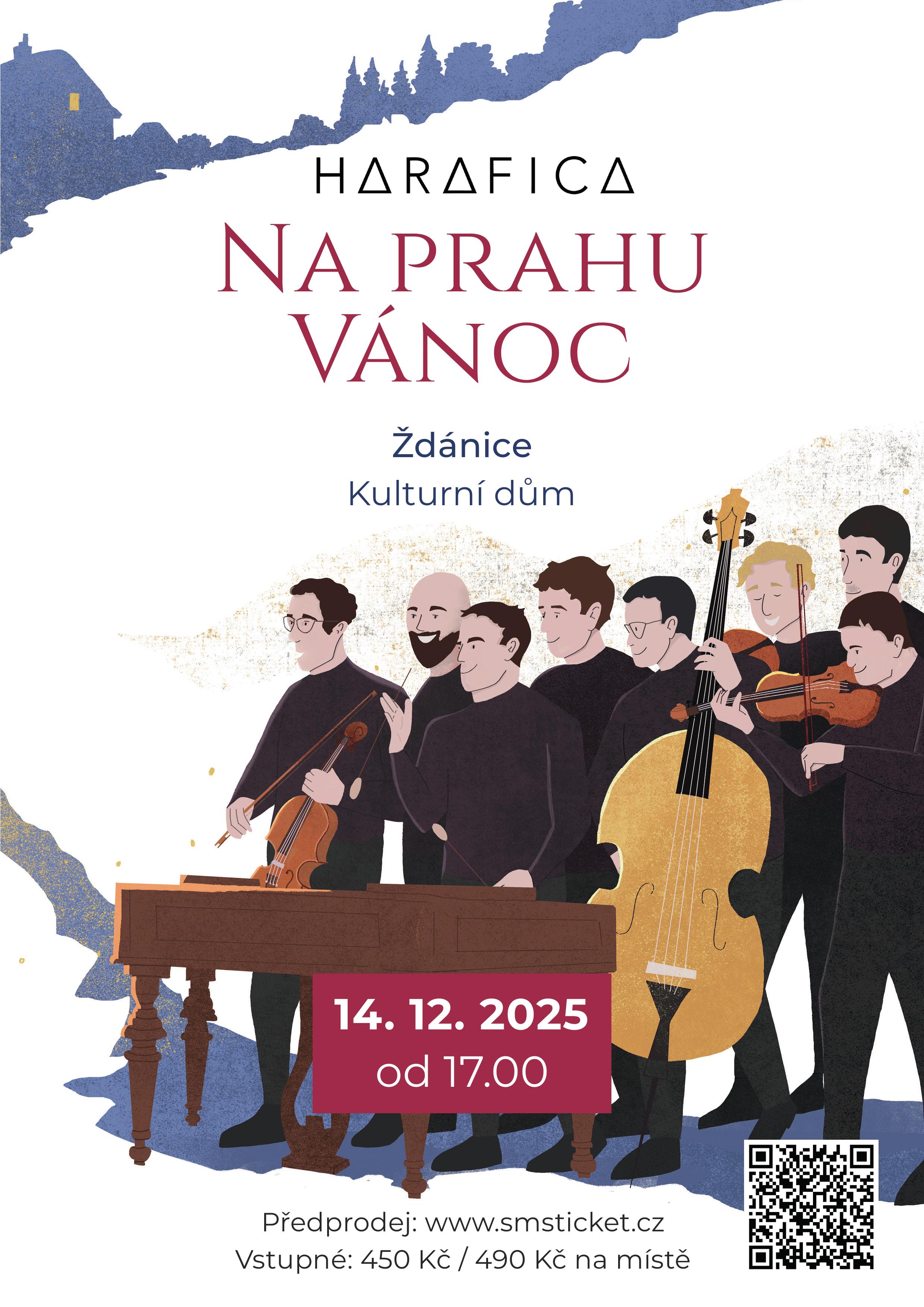 Advent bývá pro mnohé obdobím plným spěchu a shonu. 🕯️ Právě proto je koncert Na prahu Vánoc pozváním k zastavení, zklidnění a naladění na blížící se svátky. 📯 V první části večera zazní úpravy lidových i dalších písní, které rozezní sál živou náladou. 🎶 Druhá část se pak ponese v duchu adventních a vánočních melodií, jež navodí klid a sváteční pohodu. 🎄 Hudba se tak stává společným prostorem, kde se můžeme na chvíli nadechnout a otevřít dveře k nejkrásnějším dnům v roce – k Vánocům. ✨ 🎻 Harafica je dynamická muzika z Uherského Hradiště, známá citlivým propojováním tradic s novými hudebními vlivy. Její koncerty jsou vždy plné energie, radosti i silné atmosféry.