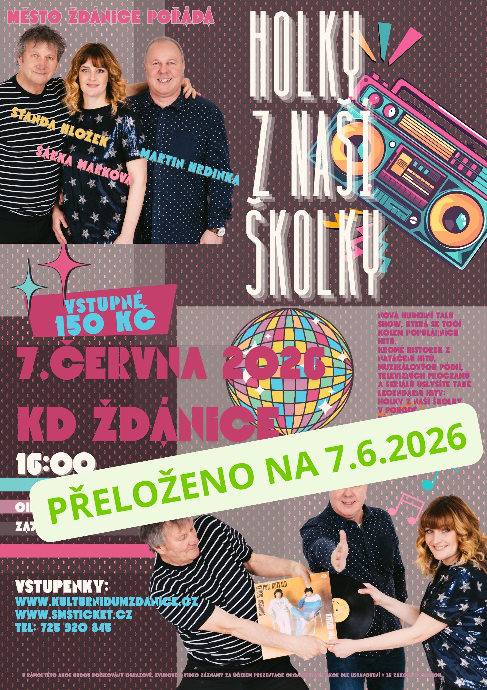 HOLKY Z NAŠÍ ŠKOLKY aneb příběhy kolem populárních hitů Standa Hložek, Martin Hrdinka, Šárka Marková Nová hudební talk show, která se točí kolem populárních hitů, které za svou kariéru nazpíval jeden z našich nejpopulárnějších zpěváků 80tých let, objevuje na předních místech anket popularity Zlatý a Český slavík. Na jednom pódiu se tak setkávají zpěvák Standa Hložek, moderátor Martin Hrdinka a zpěvačka Šárka Marková. Dozvíte se jak vznikly hity Holky z naší školky, V pohodě, Můj čas nebo Bílá královna a kromě vzpomínek na natáčení těchto i dalších písní, zazní i historky o jejich autorech, z nahrávacích studií, z muzikálových pódií i televizních programů a seriálů. Všechny tyto hity uslyšíte živě přímo u vás! Holky přijďte a nechoďte samy…
