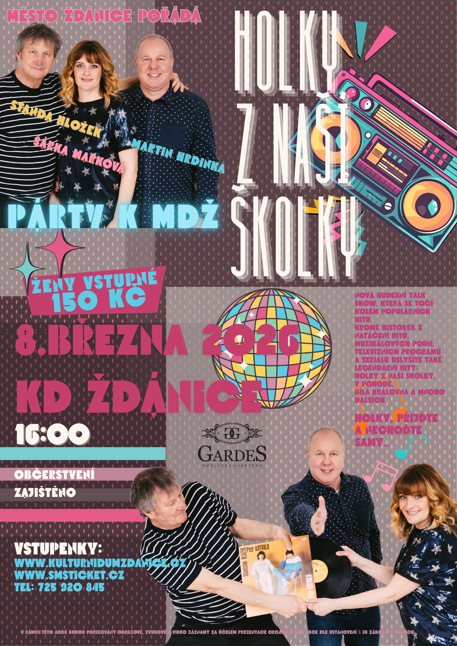 HOLKY Z NAŠÍ ŠKOLKY aneb příběhy kolem populárních hitů Standa Hložek, Martin Hrdinka, Šárka Marková Nová hudební talk show, která se točí kolem populárních hitů, které za svou kariéru nazpíval jeden z našich nejpopulárnějších zpěváků 80tých let, objevuje na předních místech anket popularity Zlatý a Český slavík. Na jednom pódiu se tak setkávají zpěvák Standa Hložek, moderátor Martin Hrdinka a zpěvačka Šárka Marková. Dozvíte se jak vznikly hity Holky z naší školky, V pohodě, Můj čas nebo Bílá královna a kromě vzpomínek na natáčení těchto i dalších písní, zazní i historky o jejich autorech, z nahrávacích studií, z muzikálových pódií i televizních programů a seriálů. Všechny tyto hity uslyšíte živě přímo u vás! Holky přijďte a nechoďte samy…